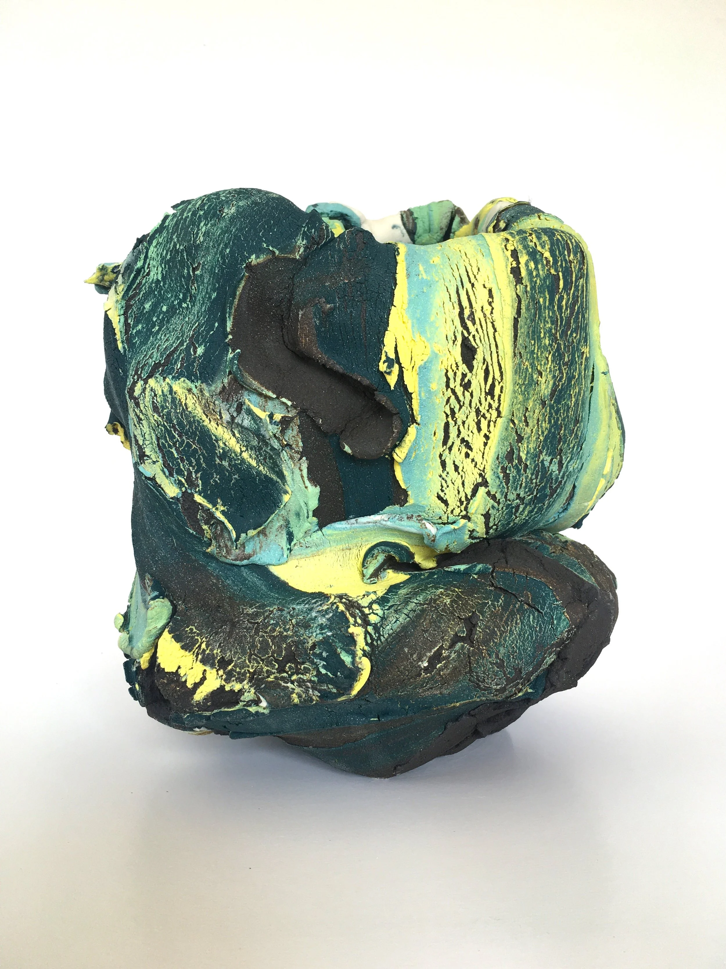 Having originally trained and worked as a production potter for the majority of my making career, my practice underwent a massive shift in recent years. Dealing with some physical constraints which affected my ability to sustain full time wheel production I decided to enroll and complete a Master of Arts through Research at TUS Limerick School of Art and Design. During this process I began to view clay as a painting medium and developed a method of building three dimensional paintings using hand dyed clay bodies and traditional hand building techniques. These expressive art pieces are akin to action or matter painting. Working with clay initially on a flat surface. I create marks and compositions, adding, layering and spreading the various coloured clay bodies together. These clay canvasses are then formed, sometimes torn apart and reassembled and built into three-dimensional works. I engage with a number of mediums, charcoal, graphite, acrylic and mono printing techniques which all feed and enrich the making process, forming a symbiotic relationship in this perpetual experimental process. I don’t aim to conclude or resolve anything , the outcomes are raw and visceral and in process , one leads to the next . This liberates me and the work from constraints and confinements.